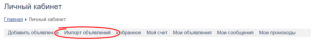 В меню личного кабинета нажмите кнопку "Импорт объявлений".