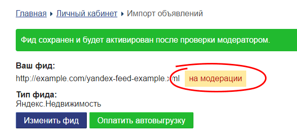 Если все правильно и Ваш фид пройдет предварительную валидацию, вы увидите следующий экран, показывающий, что фид находится на модерации.